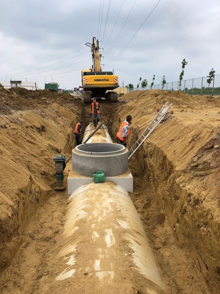 Roboty ziemne: ~ 20 000 m3 Podbudowy pod posadzki: ~ 5 000 m2 Nawierzchnie z kostki betonowej: ~ 5 000 m2 Nawierzchnia z kruszywa: ~ 1 000 m2 Kanalizacje deszczowe i sanitarne: ~ 500 mb Podziemne zbiorniki na wodę do zaopatrzenia P.POŻ.: ~ 300 m3 Podziemne pompownie P.POŻ. Instalacje hydrantowe wewnętrzne. |