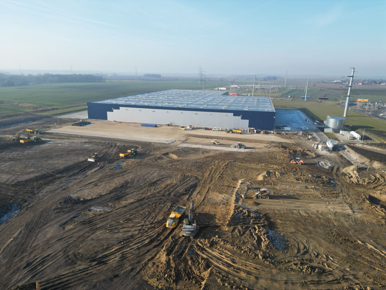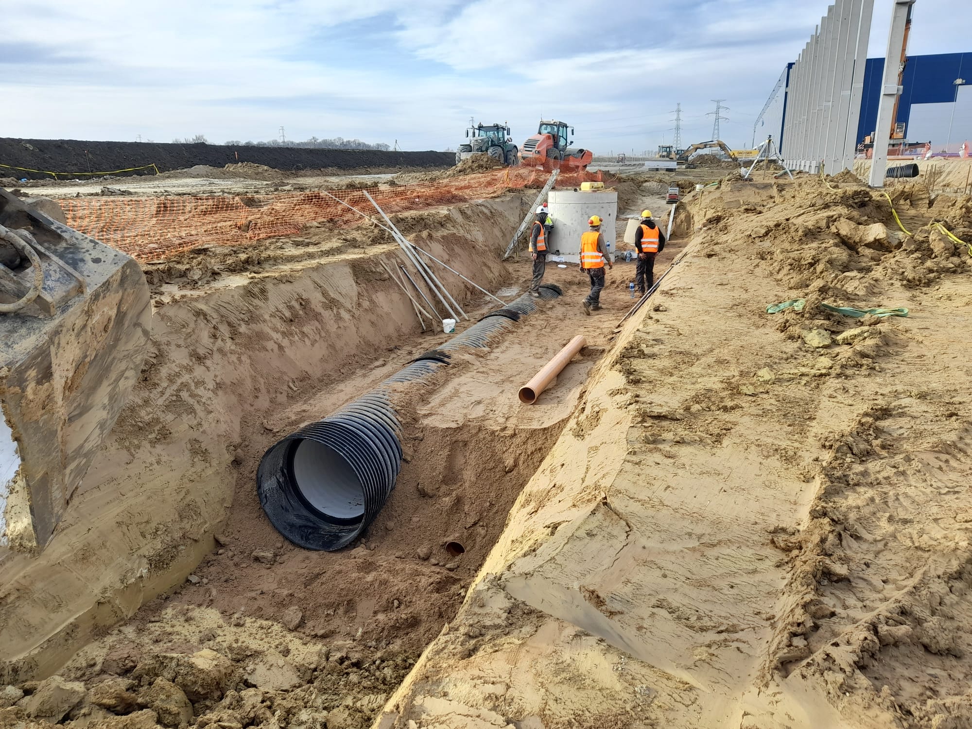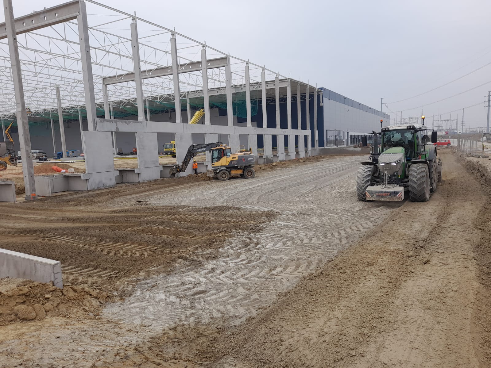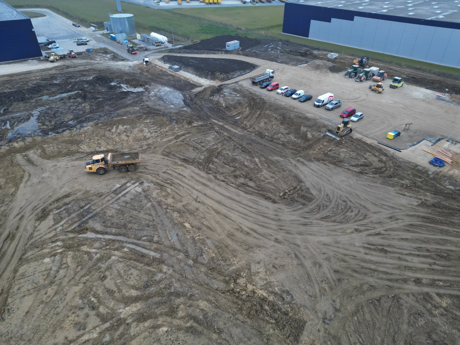 Roboty ziemne: ~ 95 000m3 Projekty branżowe drogowe i instalacyjne. Podbudowy pod posadzki: ~ 25 000m2 Nawierzchnie z kostki betonowej: ~ 12 000m2 Kanalizacje deszczowe i sanitarne: ~ 800mb Instalacje pożarowe: ~ 500mb Pompownie sanitarne. |