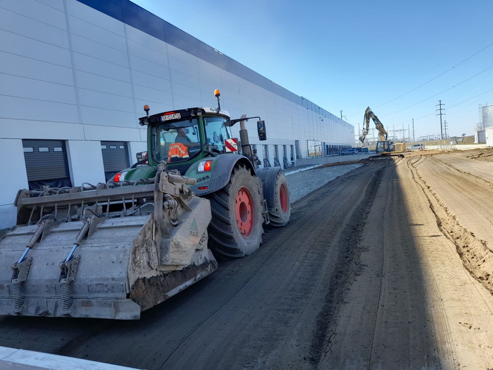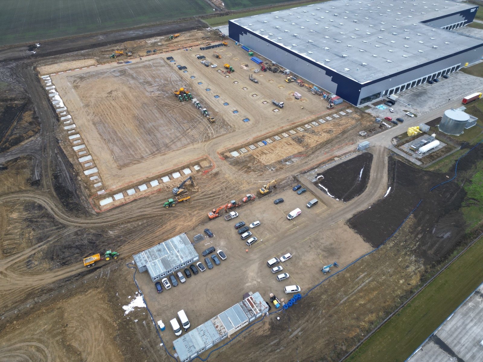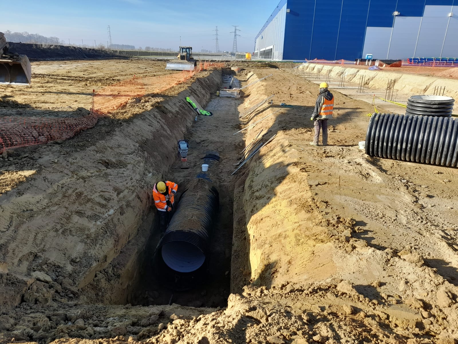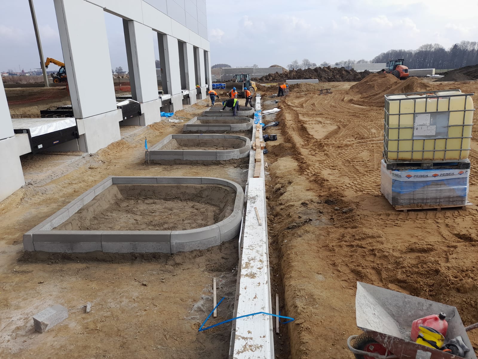 Roboty ziemne: ~ 95 000m3 Projekty branżowe drogowe i instalacyjne. Podbudowy pod posadzki: ~ 25 000m2 Nawierzchnie z kostki betonowej: ~ 12 000m2 Kanalizacje deszczowe i sanitarne: ~ 800mb Instalacje pożarowe: ~ 500mb Pompownie sanitarne. |