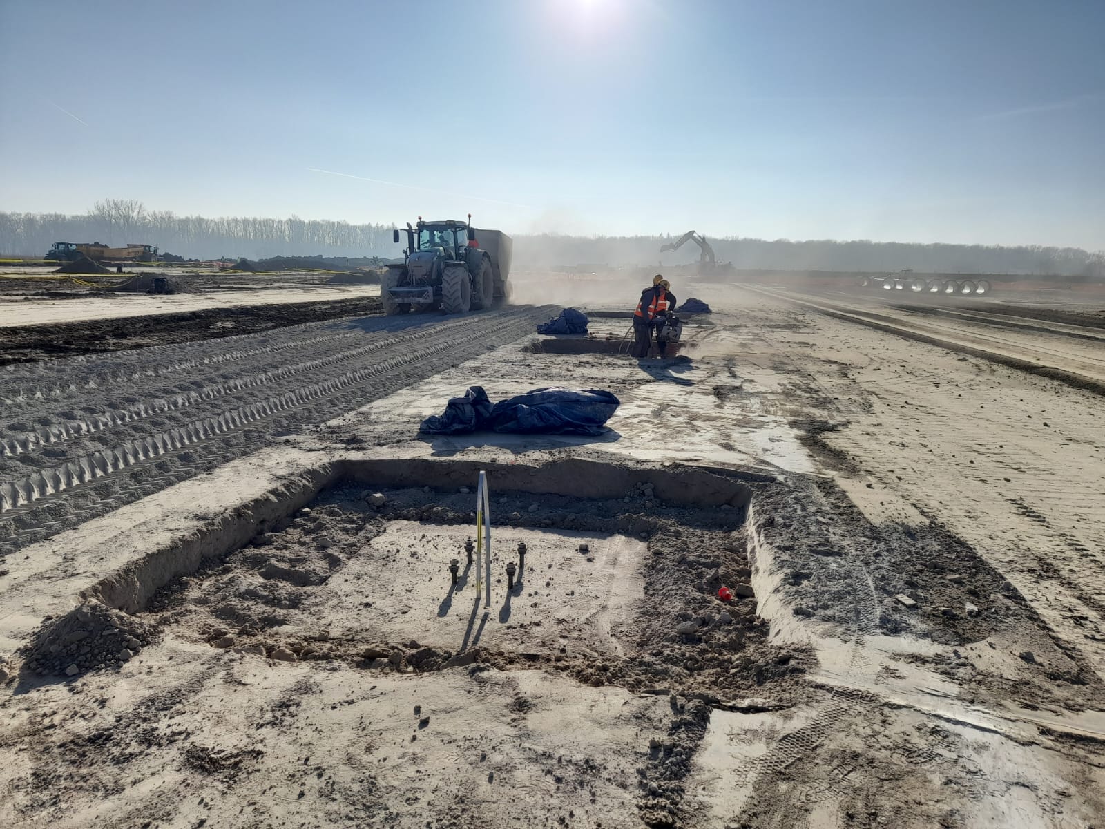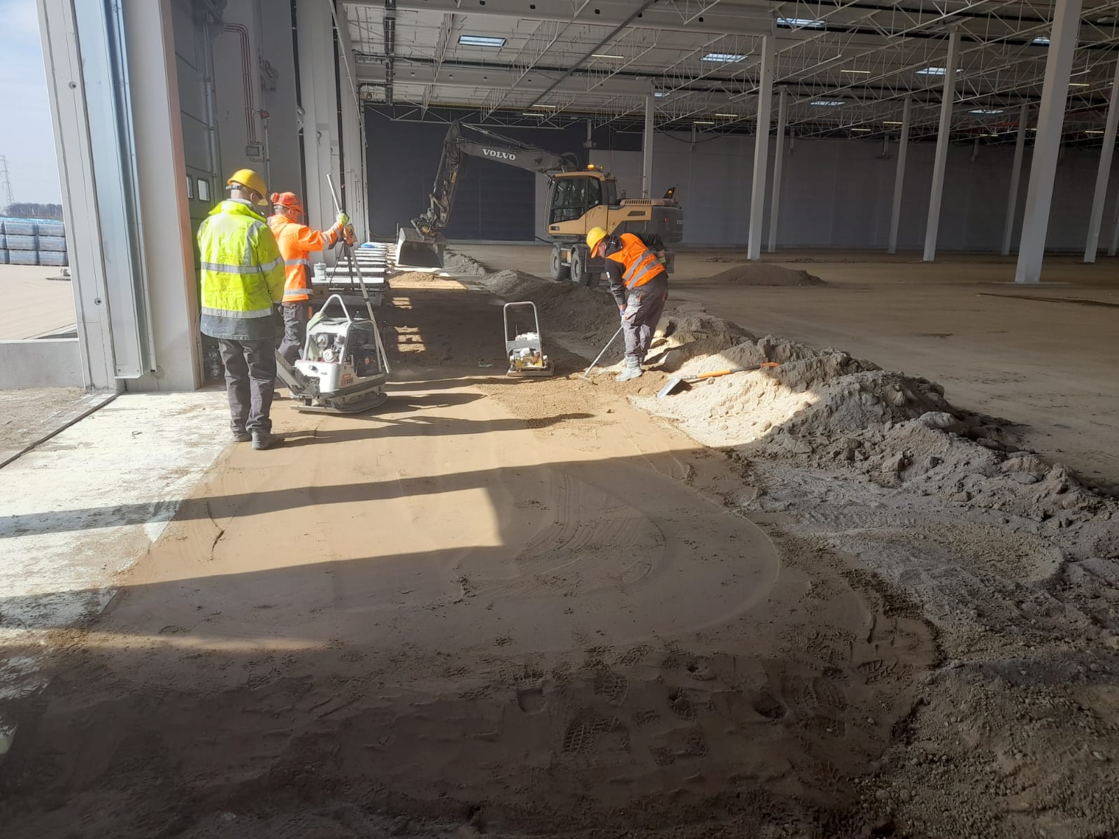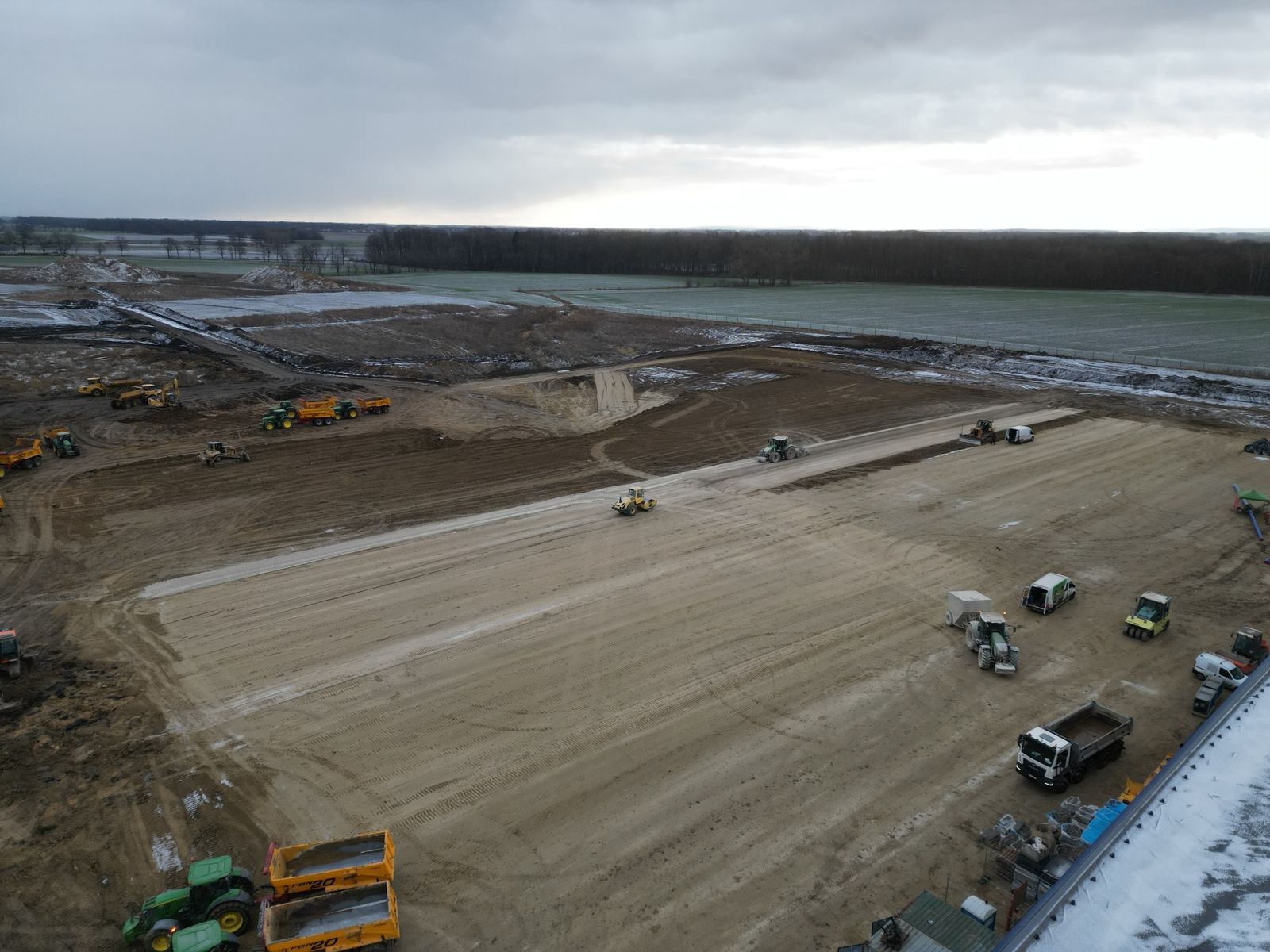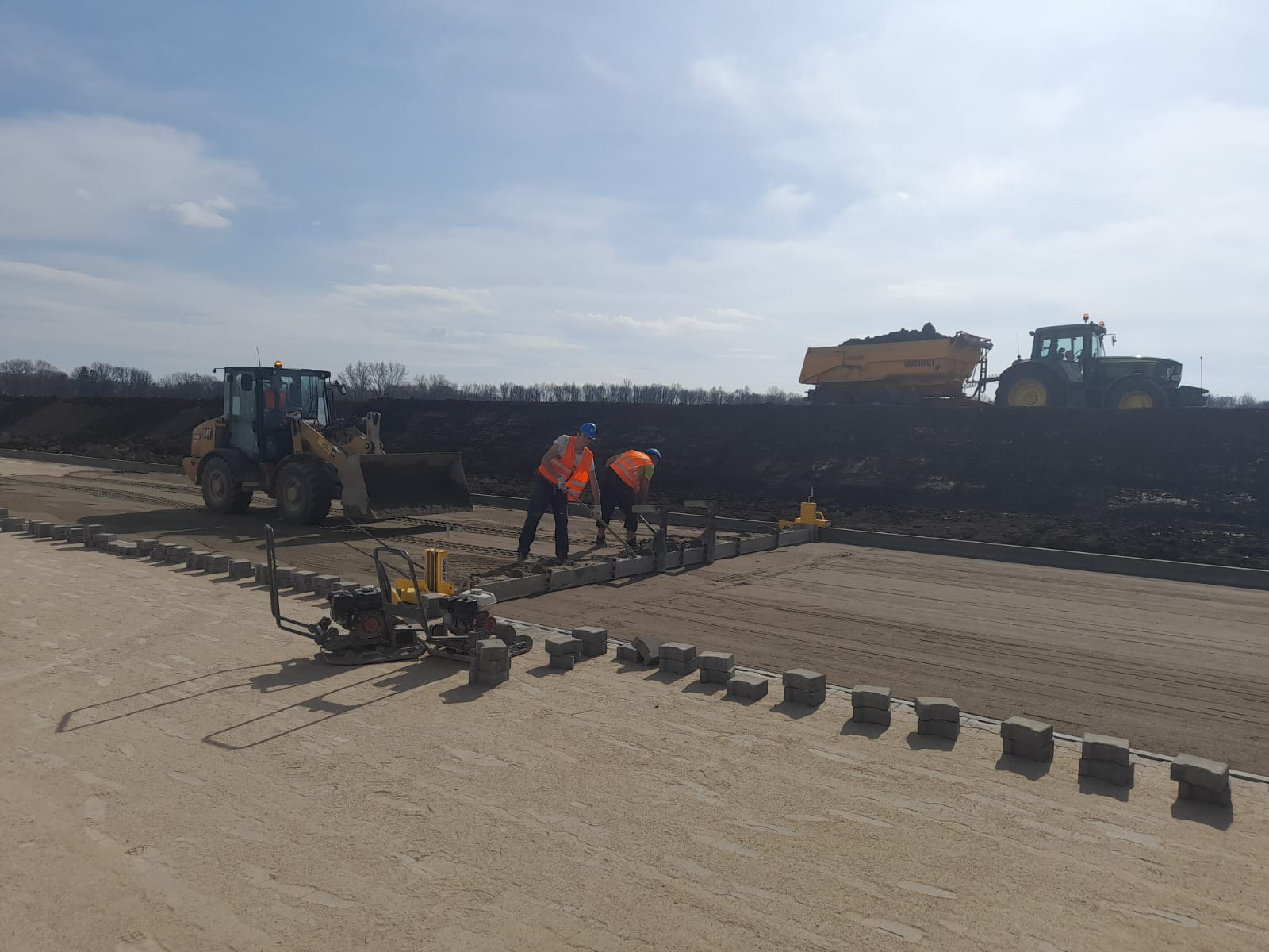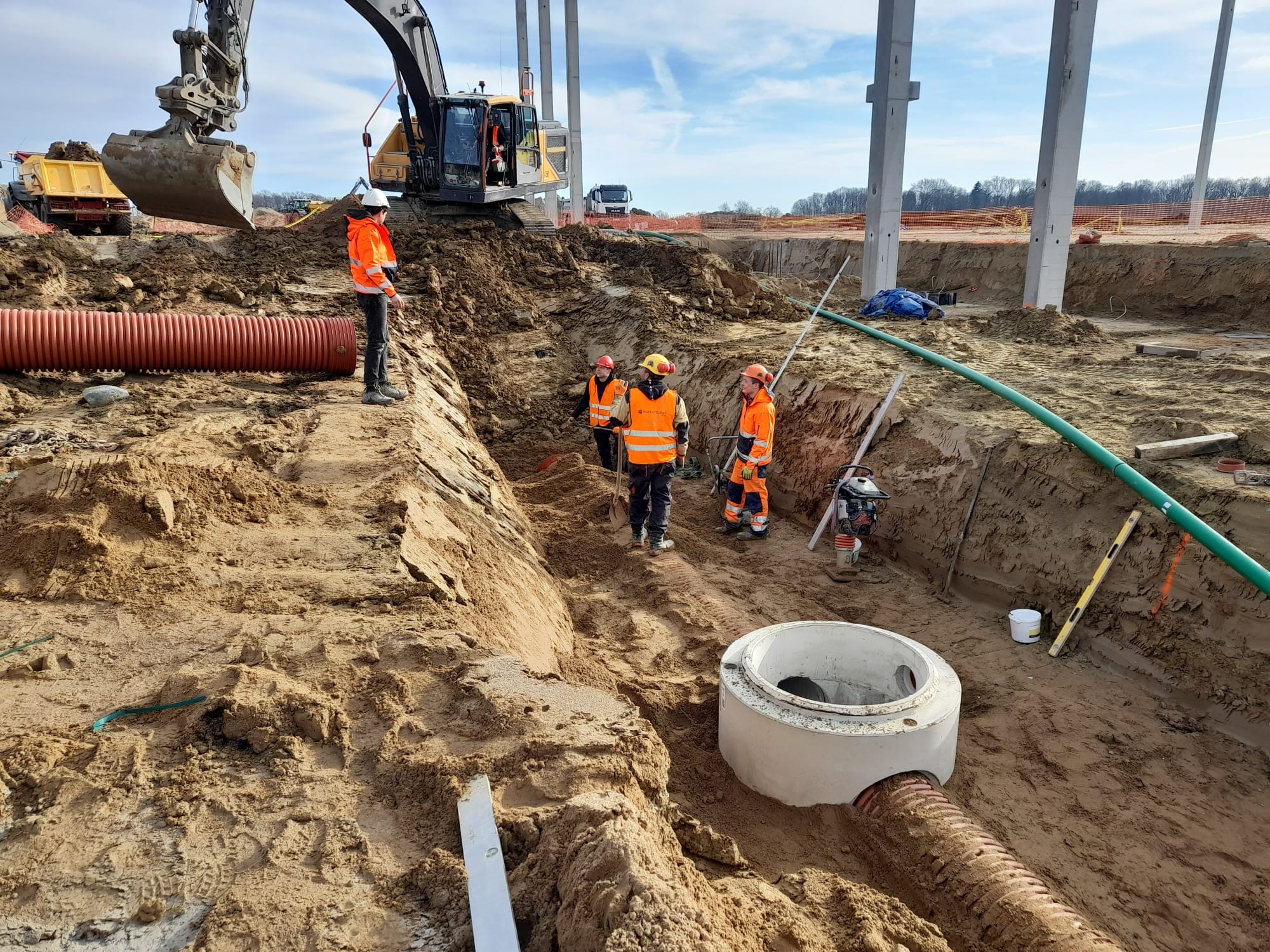 Roboty ziemne: ~ 95 000m3 Projekty branżowe drogowe i instalacyjne. Podbudowy pod posadzki: ~ 25 000m2 Nawierzchnie z kostki betonowej: ~ 12 000m2 Kanalizacje deszczowe i sanitarne: ~ 800mb Instalacje pożarowe: ~ 500mb Pompownie sanitarne. |