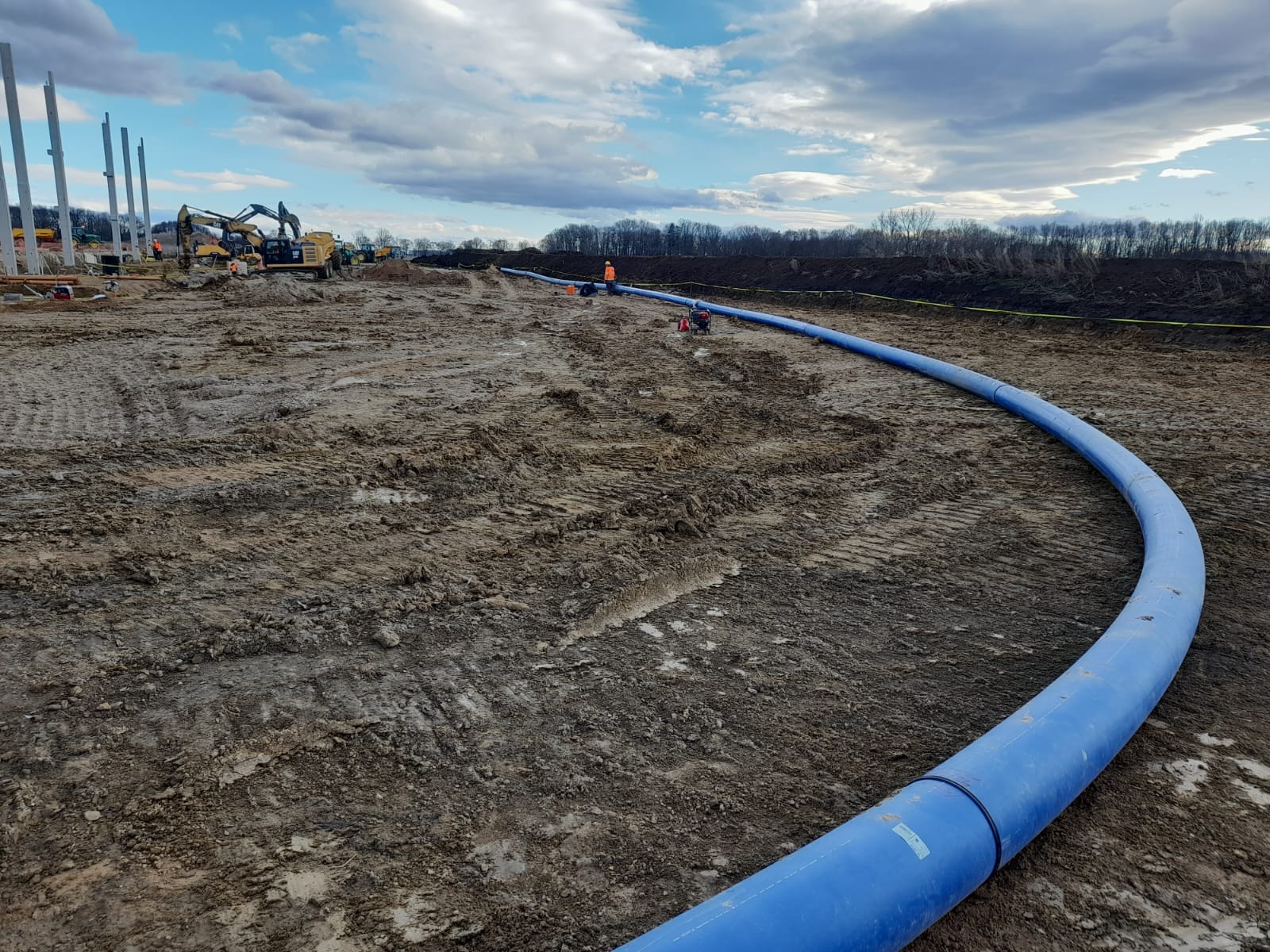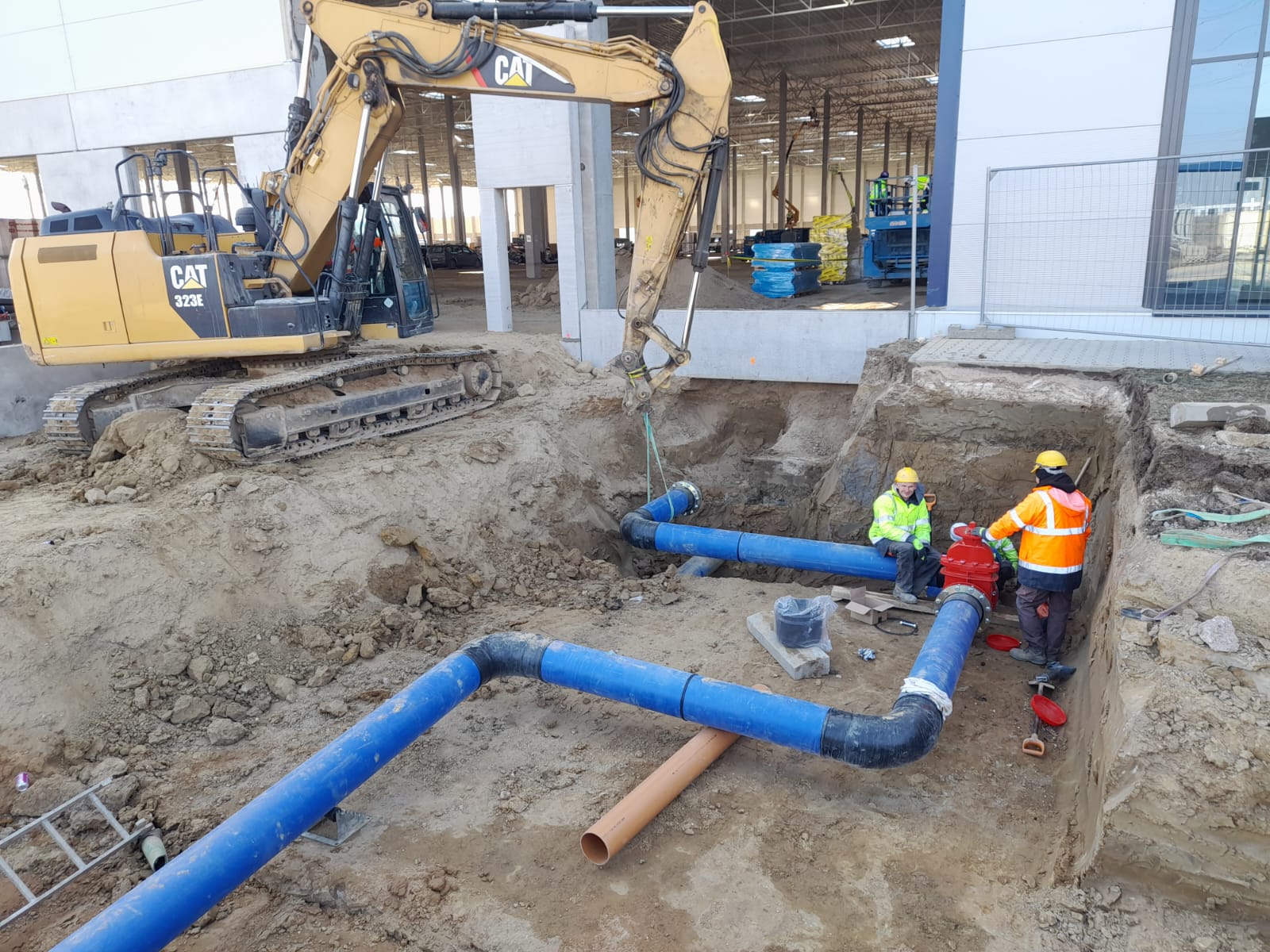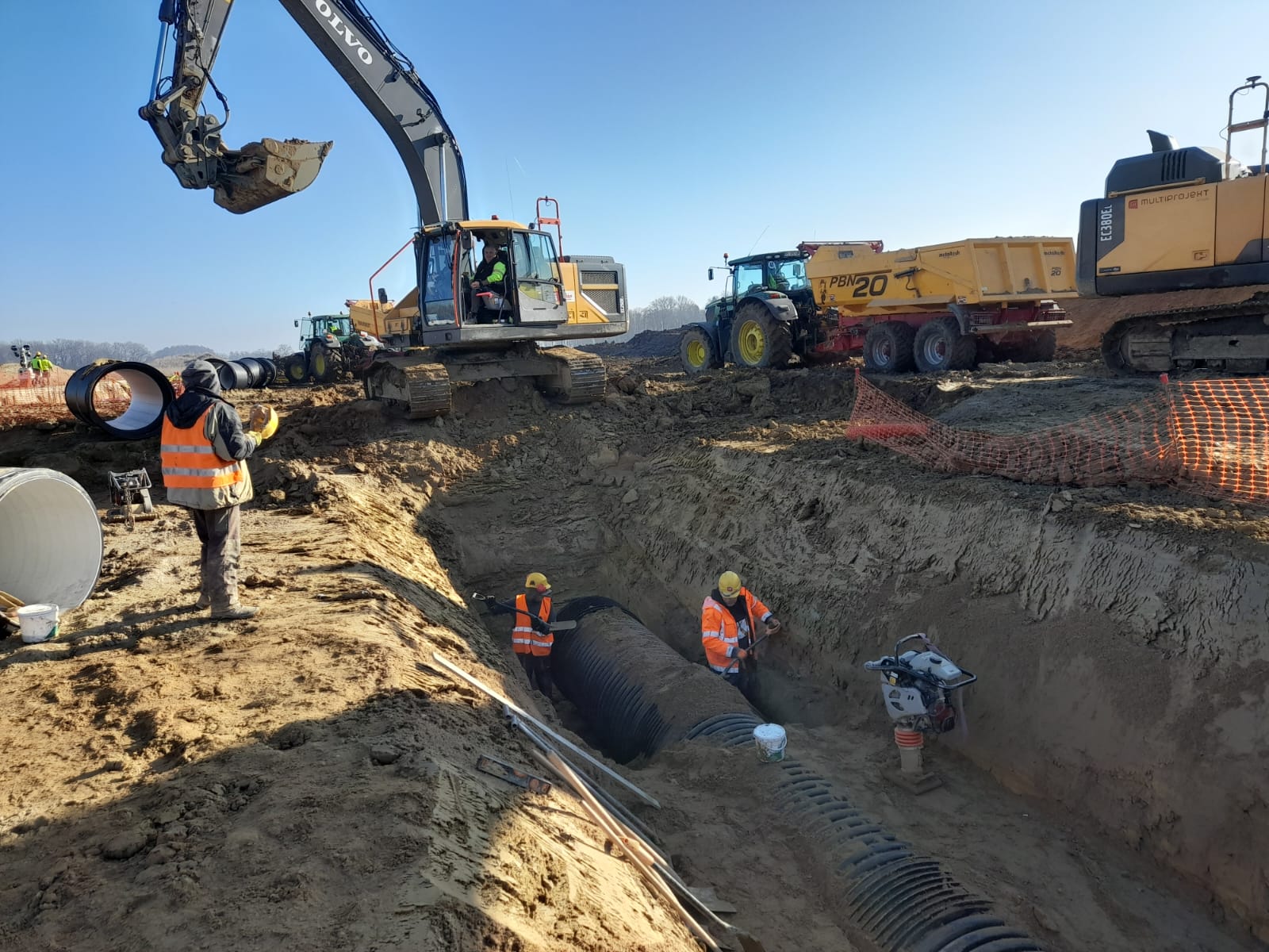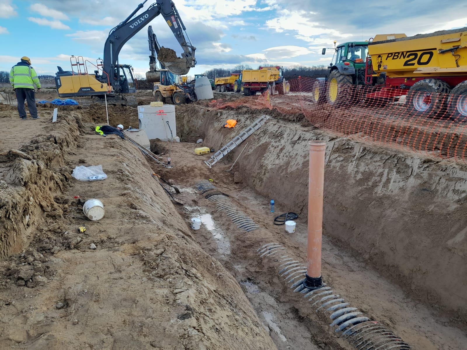 Roboty ziemne: ~ 95 000m3 Projekty branżowe drogowe i instalacyjne. Podbudowy pod posadzki: ~ 25 000m2 Nawierzchnie z kostki betonowej: ~ 12 000m2 Kanalizacje deszczowe i sanitarne: ~ 800mb Instalacje pożarowe: ~ 500mb Pompownie sanitarne. |