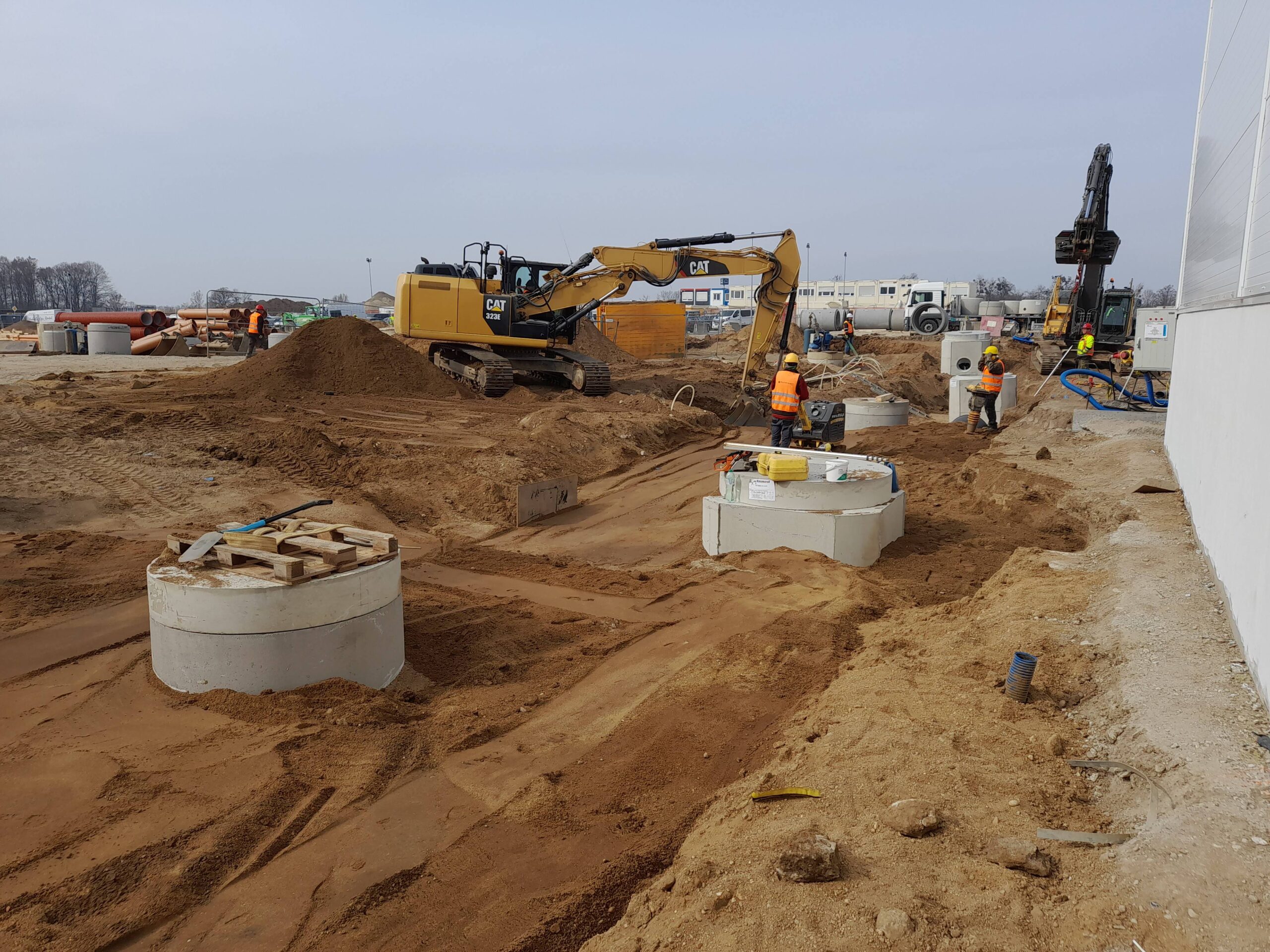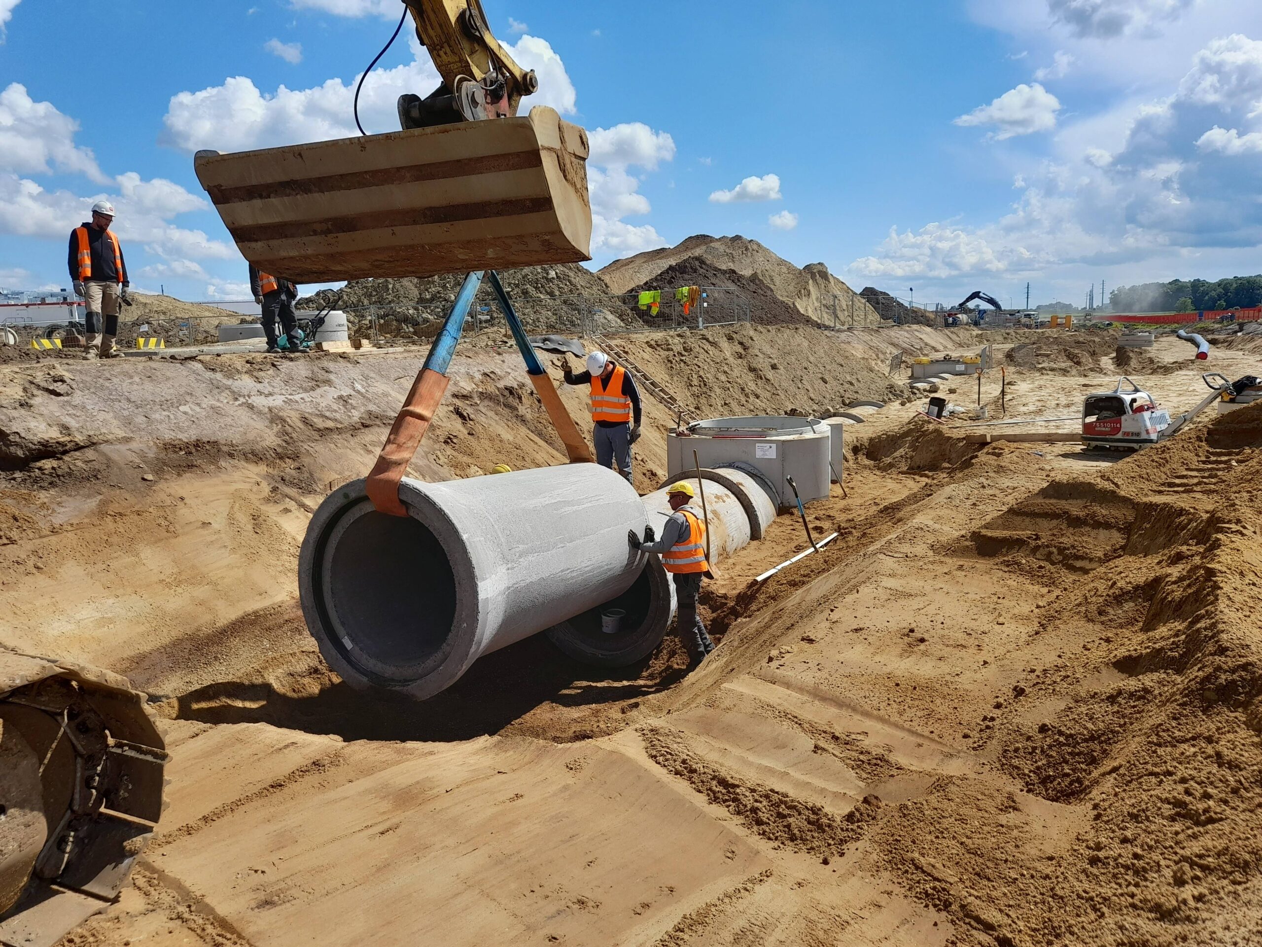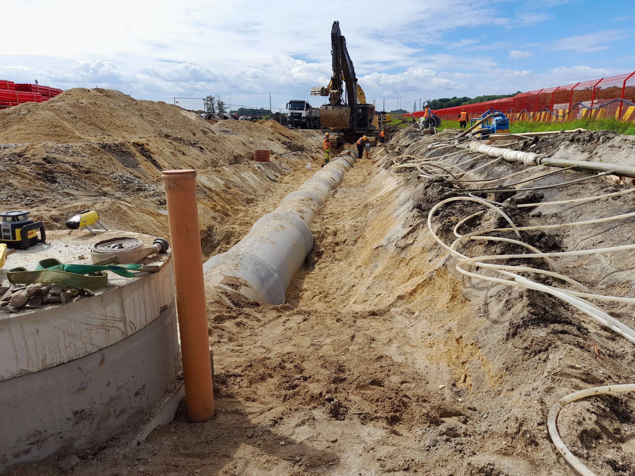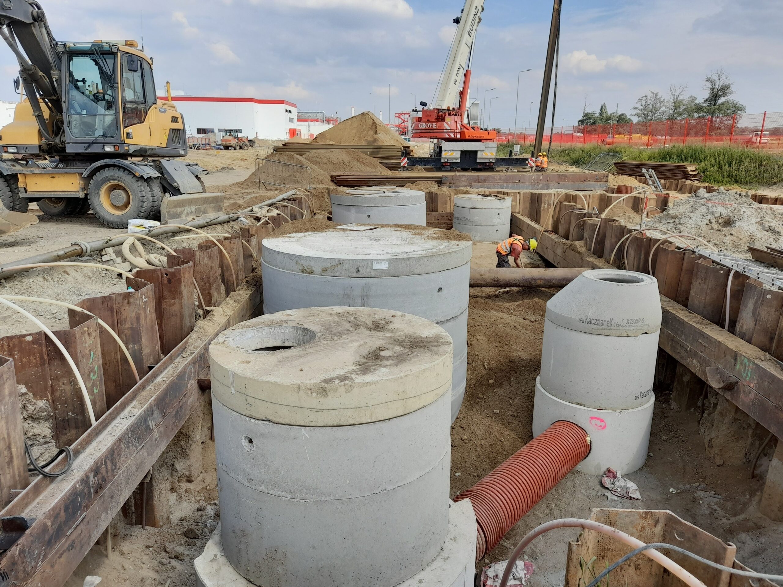 Projekty branżowe instalacyjne. Roboty ziemne: ~ 55 000m3 Kanalizacje deszczowe i sanitarne: ~ 7 500mb Podziemne zbiorniki retencyjne na wody opadowe: ~ 2 300m3 Instalacje wodociągowe: ~ 300mb Instalacje pożarowe: ~ 1 200mb Instalacje gazowe: ~ 600mb Sieci technologiczne: ~ 500mb Ścianki szczelne: ~ 5 000m2 Przewierty: ~ 800mb Przyłącza wodociągowe i sanitarne. Odwodnienie terenu. |