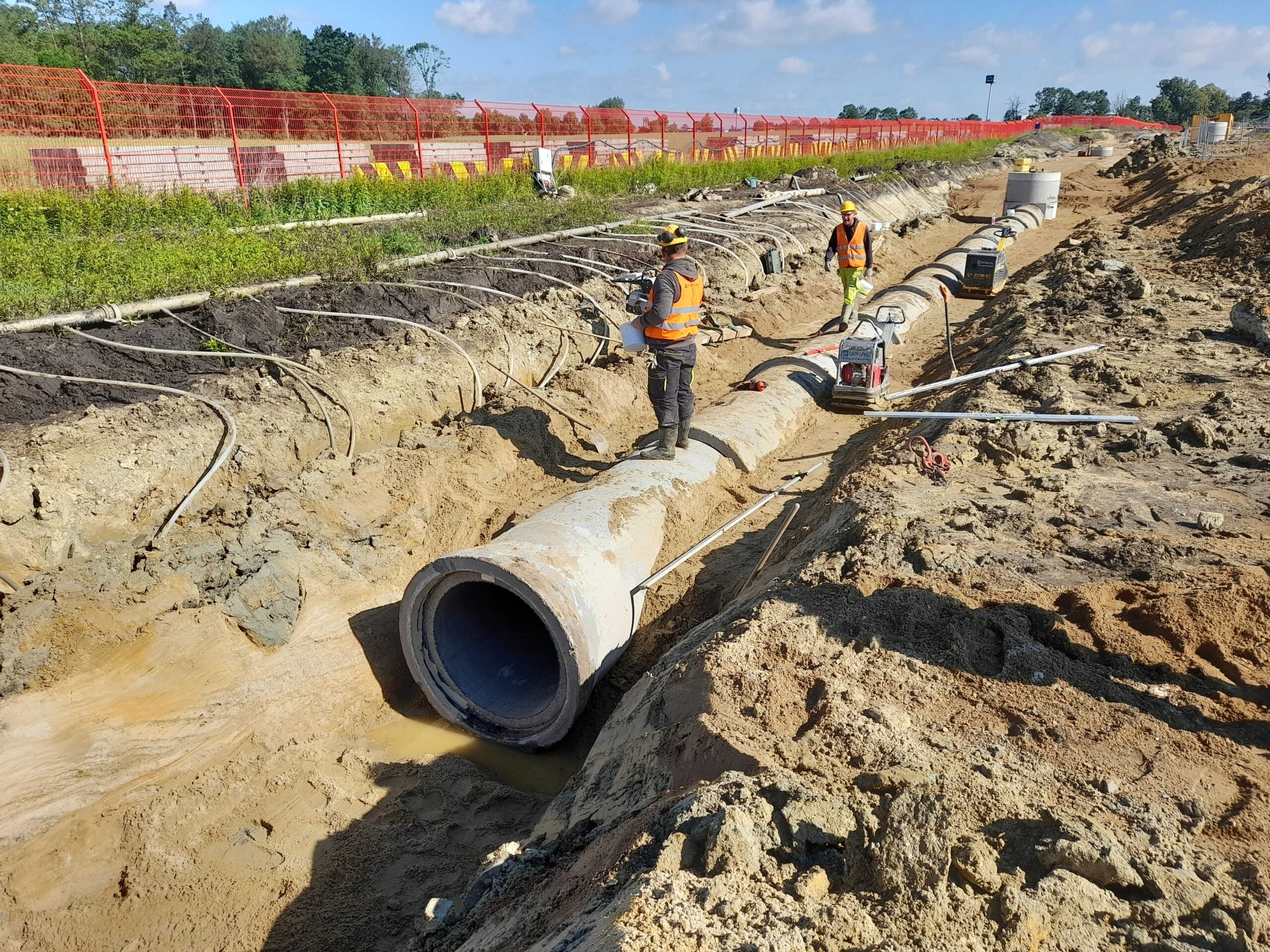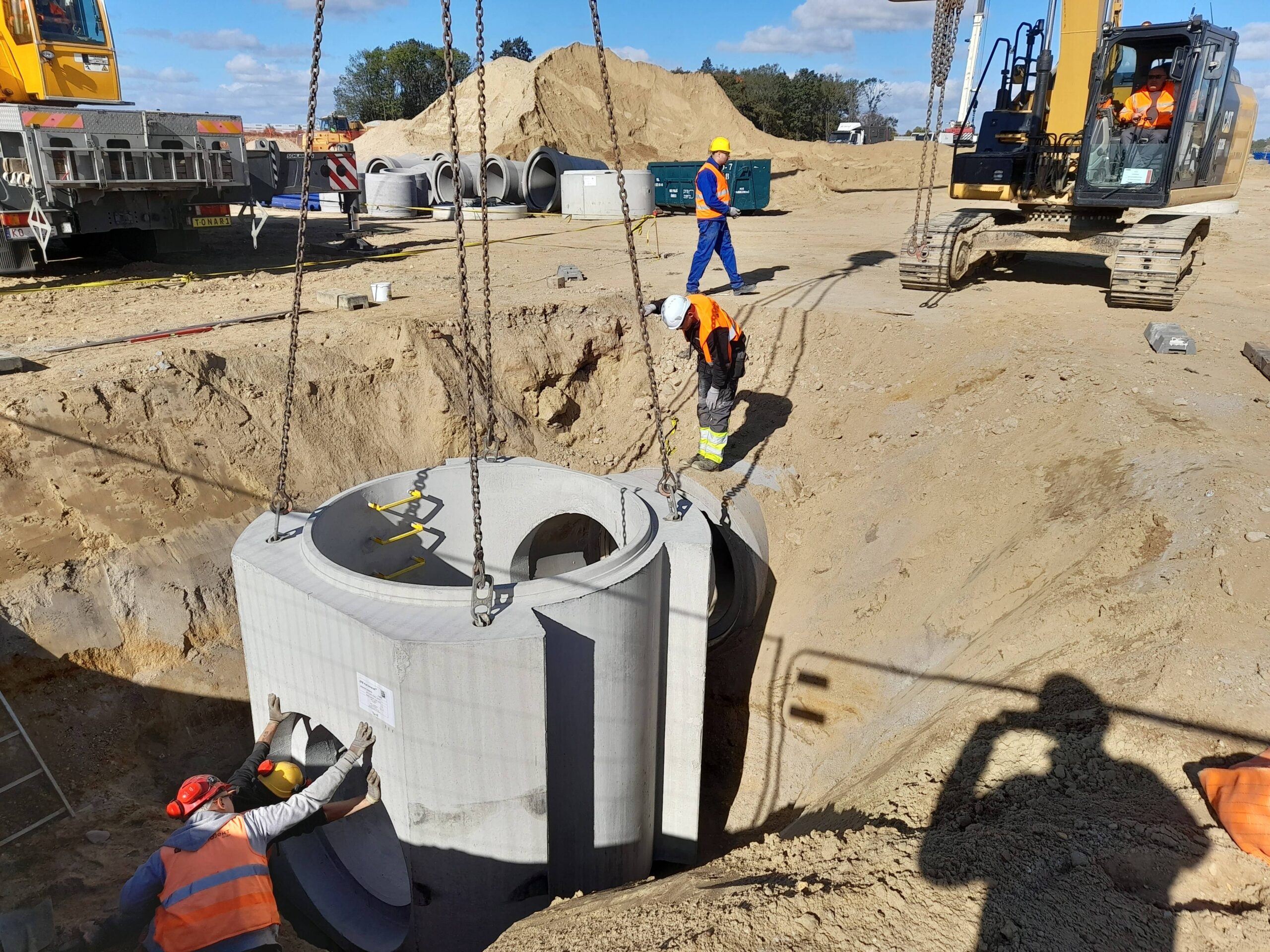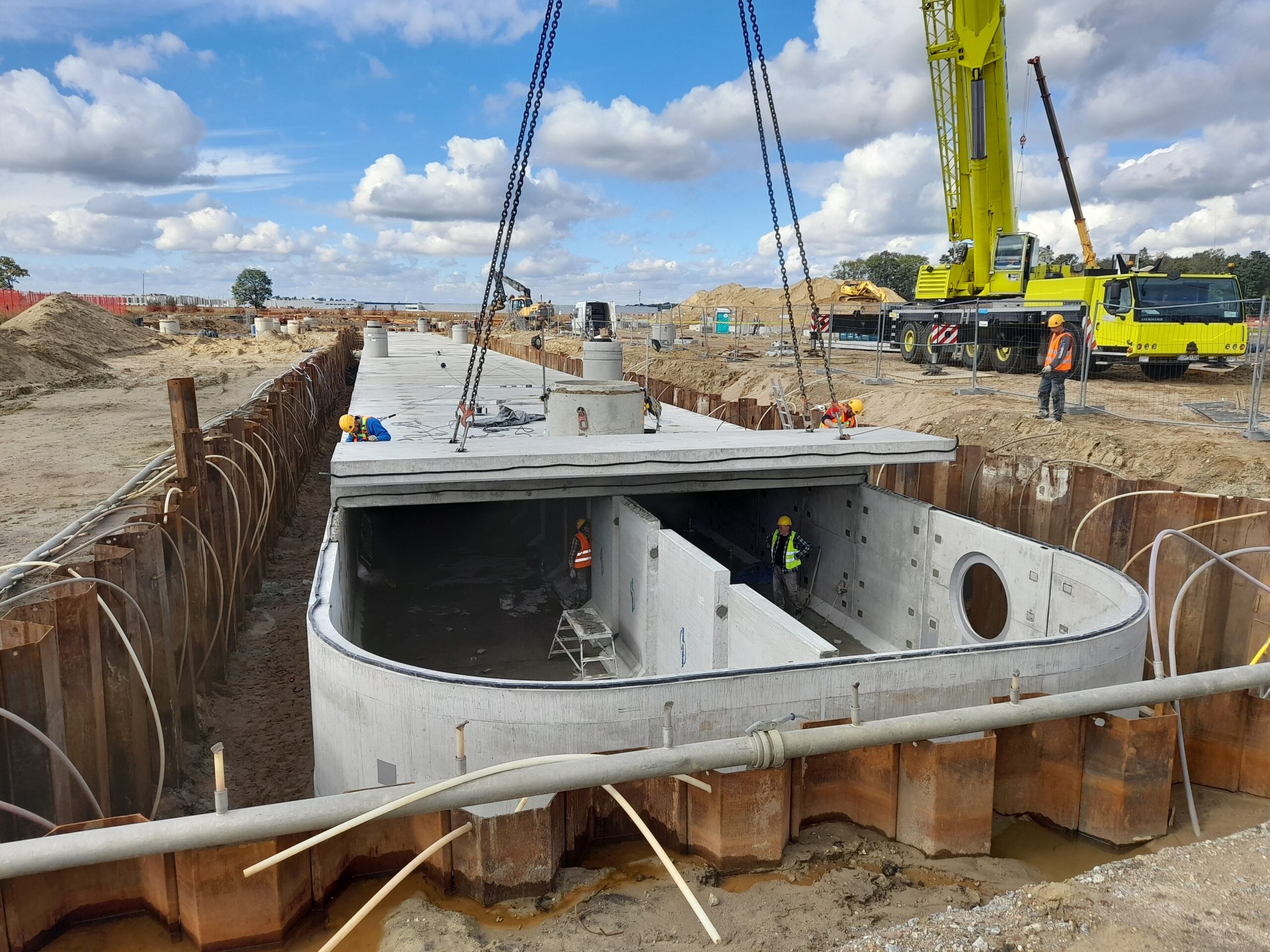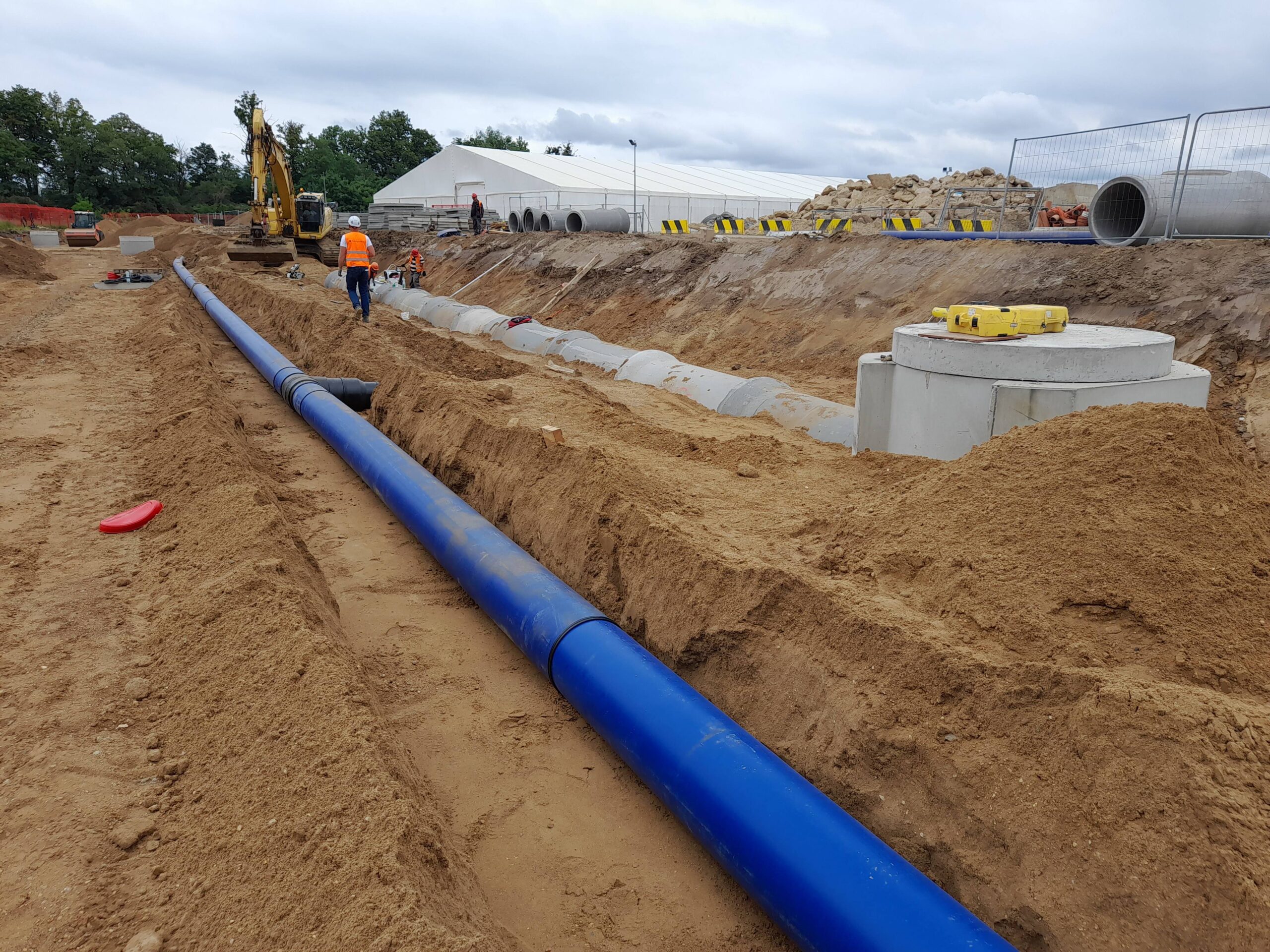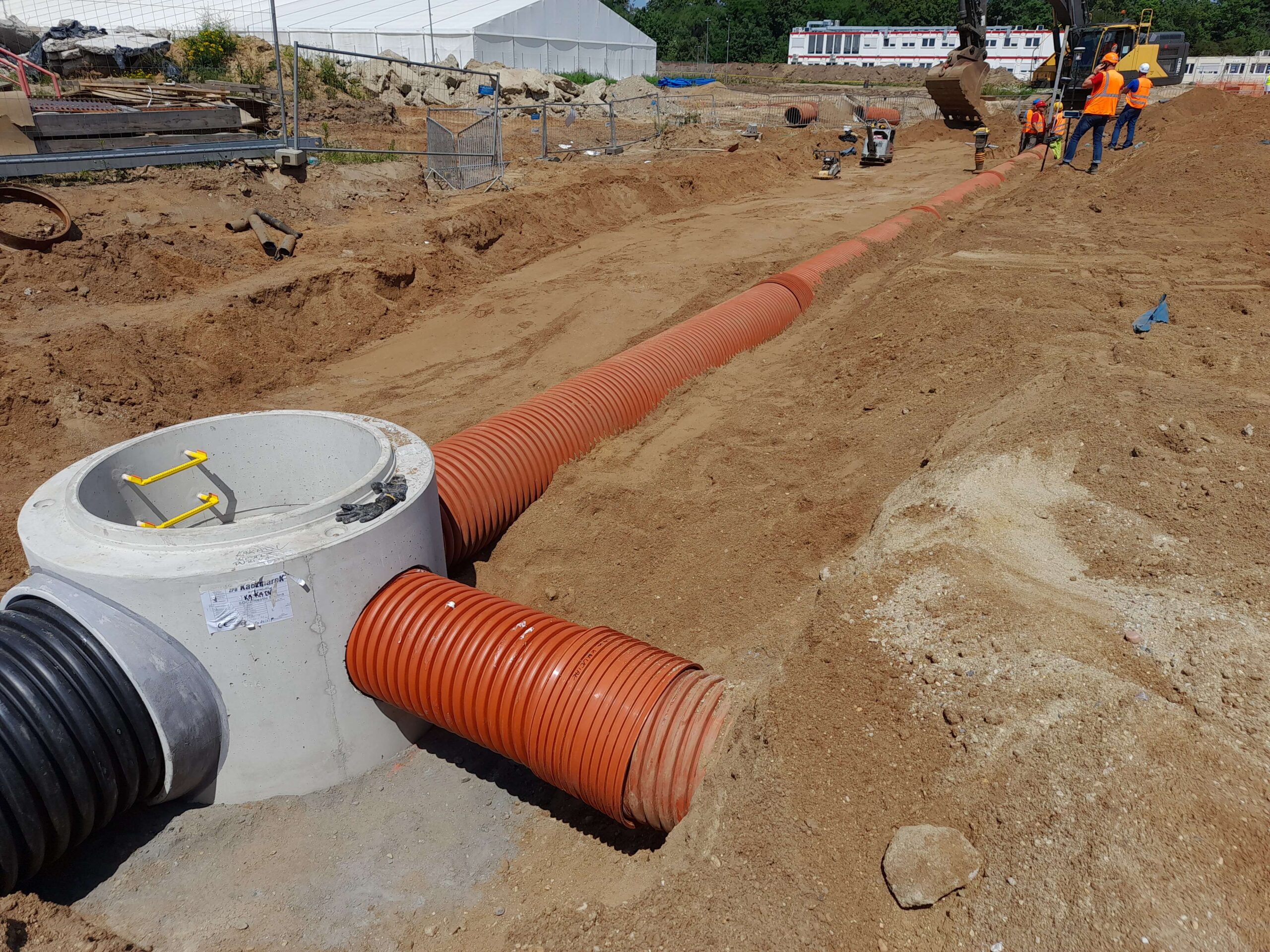 Projekty branżowe instalacyjne. Roboty ziemne: ~ 55 000m3 Kanalizacje deszczowe i sanitarne: ~ 7 500mb Podziemne zbiorniki retencyjne na wody opadowe: ~ 2 300m3 Instalacje wodociągowe: ~ 300mb Instalacje pożarowe: ~ 1 200mb Instalacje gazowe: ~ 600mb Sieci technologiczne: ~ 500mb Ścianki szczelne: ~ 5 000m2 Przewierty: ~ 800mb Przyłącza wodociągowe i sanitarne. Odwodnienie terenu. |